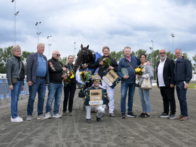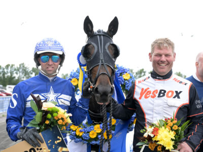 – Han har tidigare tävlat med open eye, men nu valde jag att köra med öppet huvudlag för att få hästen ännu lugnare. Han öppnade också bra och dödens fick bli vår position. Han pullade inte bort några krafter, utan jag kunde hålla det tempo som jag ville, säger Per Nordström i vinnarcirkeln.